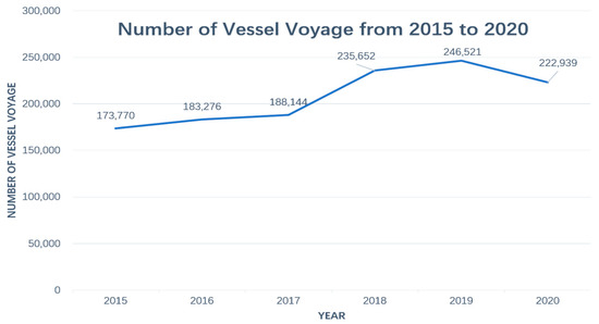 A comparison of the number of vessel voyages on the NEP from 2015 to 2020 to preliminarily delineate the evolution stages of vessel activities during this period is shown in Figure 2.