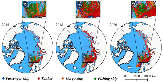 The Arctic is rich in natural resources, including energy, minerals, and biological resources, and is known as the “Middle East at the end of the Earth”. For example, the Siberian Basin and Barents Sea regions have abundant oil and gas resources. The extraction and processing of petroleum resources and the construction of dedicated port terminals influence the spatiotemporal patterns of tanker activities, resulting in dense tanker traffic in the Barents Sea and Norwegian Sea regions. Additionally, the increasing oil demand from countries such as China and Japan, as well as the shift in Russia’s oil export direction, have led to increased tanker activities in the Barents Sea—Kara Sea—Laptev Sea—East Siberian Sea. The inflow of the Atlantic Current and North Cape Current results in abundant plankton in the Norwegian Sea and Barents Sea, rich in fishery resources. The surrounding areas have developed fishing industries and the warm currents extend the navigable period, leading to a high concentration of fishing vessels year-round (as shown in Table 4) [11].