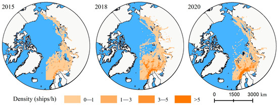 As shown in Figure 5, the spatial distribution of traffic flow density can show the areas where ships tend to gather on the Arctic Northeast Passage, which plays a vital role in analyzing navigation safety. Regarding vessel density in the Arctic, the entire NEP had a similar overall density in 2015 due to the low number of vessels. By 2018, vessel density increased significantly in the Norwegian, Finnish, and Swedish waters, with denser areas gradually approaching the Arctic center. Some areas in the Kara Sea also reached a density of over five vessels per hour, and the high-density area gradually extends eastward. In 2020, the area with a density greater than five vessels per hour further expanded, showing a significant change compared to 2015.