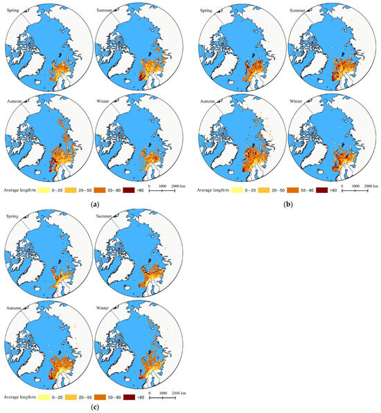 Seasonal distribution of fishing vessel length: (a) represents 2015; (b) represents 2018; (c) represents 2020.