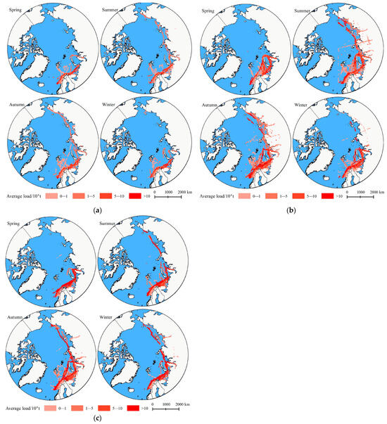 Seasonal distribution of ship trajectories on the Arctic Northeast route: (a) represents 2015; (b) represents 2018; (c) represents 2020.