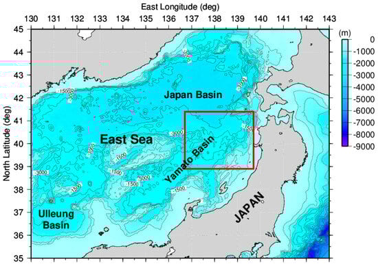 The East Sea comprises three sub-basins, which are a mature back-arc basin behind Japan island arcs in the northwestern Pacific, in Figure 1. In comparison with the Japan basin, which is a deep (>3000 m) and large back-arc basin located in the northeastern part of the East Sea, the Yamato basin is a relatively shallow (<3000 m) back-arc basin, similarly to the Ulleung basin [19]. This study area (136.7°–139.7° E, 38.9°–41.4° N) selected is the red box in the location map in Figure 1. The bathymetry as a background from ETOPO1 is also depicted in Figure 1. The spatial resolution and accuracy of ETOPO1 are 1 arc-minute and 10 m, respectively [18]. The water depth in the Yamato basin in the East Sea is less than 3000 m.