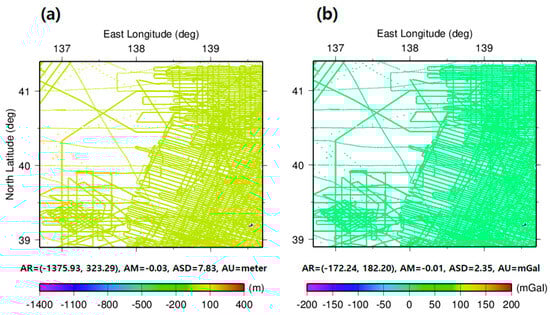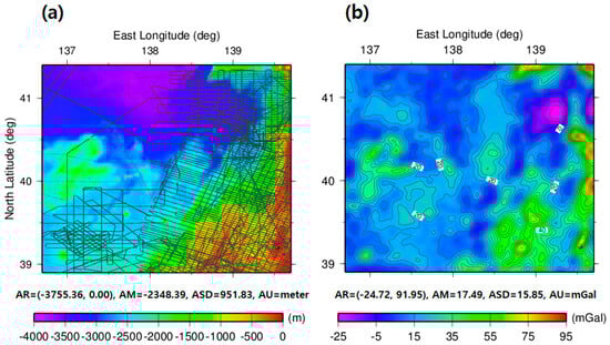 Figure 2a portrays the ETOPO1 bathymetry with superimposed 108,056 shipborne measurements (including depth and gravity anomalies) locations provided by the National Centers for Environmental Information (NCEI) and the National Oceanic and Atmospheric Administration (NOAA). About 72,045 control points and 36,011 checkpoints accounting for the 108,056 NCEI shipborne measurements were selected to determine a tuning density contrast by checkpoint using GGM. The depths from ETOPO1 in this study area ranged from −3755.4 to 0.0 m, as illustrated in the background in Figure 2a. The 1 arc-minute satellite altimetry-derived FAGAs [20] obtained from Scripps Institution of Oceanography (SIO), University of California, San Diego, used to improve bathymetry in this study area are presented in Figure 2b. The spatial resolution and accuracy of satellite altimetry-derived FAGAs are 1 arc-minute and 2 mGal (1 mGal = 1 × 10−5 m/s2) [20]. Attributes (AR, AM, ASD, and AU) listed for subsequent maps represent amplitude range (minimum and maximum values), amplitude mean, amplitude standard deviation, and amplitude unit, respectively.