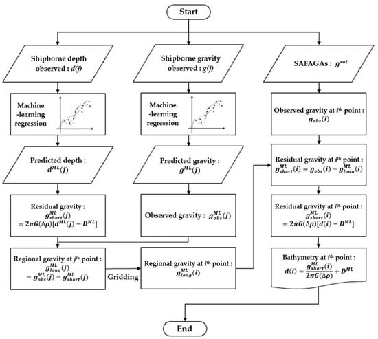 This research utilized the shipborne depth and gravity anomalies predicted by the optimal machine learning model with the best performance to estimate bathymetry by the GGM. Figure 3 reveals this study’s flowchart on the GGM bathymetry estimation using depth and gravity predicted from the optimal machine learning model.