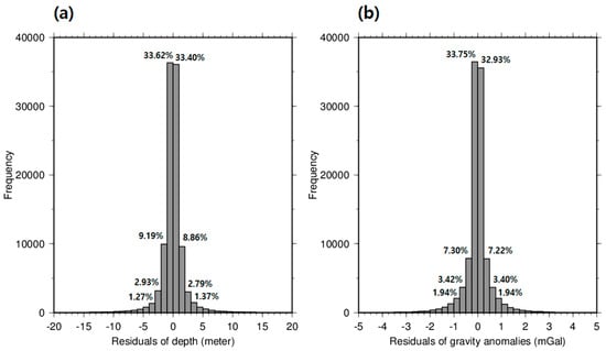 Figure 5 details the histograms of the residuals of depth and gravity anomalies predicted using the exponential GPR. From the histograms of the residuals of the depth and the gravity anomalies between observed and predicted values in Figure 5, 94.95% of the residuals of depth were distributed between −5.0 and 5.0 m, and the 95.69% of the residuals of gravity anomalies were distributed between −1.5 and 1.5 mGal.