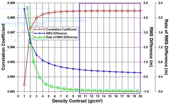 The 72,045 control points were used to evaluate the stability of the GGM estimations over a range of density contrasts by the checkpoint method with GGM in Figure 6. As shown in Figure 6, we selected the range of acceptable density contrasts as 10.0 g/cm3 and higher from a root mean-square (RMS) difference, a rate of RMS difference, and a correlation coefficient between the control and checkpoints by GGM estimations. At values of 10.0 g/cm3 and larger, firstly, the correlation coefficient between the control and checkpoints from the GGM estimates levels off at the red curve; secondly, the RMS difference and its rate of RMS difference between the control and checkpoints are stabilized at the blue and green curves, respectively. In this study, the acceptable range of the density contrasts, which minimize the RMS difference from 4.59 m to 0.28 m on the blue one of three curves in the trade-off diagram, was selected at 10.0 g/cm3 and larger in Figure 6.