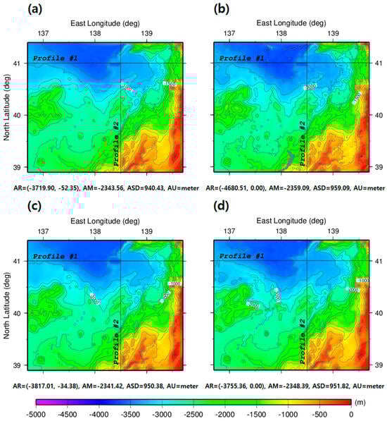 The four bathymetry models were compared to validate the local depth variations in two Profiles: Profile #1 (the east-west direction along 41° N) and Profile #2 (the north-south direction along 138.5° E), shown as black lines in Figure 7. The results are shown in Figure 10. The depths of the four bathymetry models in Profile #1 were strongly correlated, with correlation coefficients between 0.9854 and 0.9997. For Profile #2, the correlation coefficients were also very strongly correlated with correlation coefficients between 0.9923 and 0.9992.