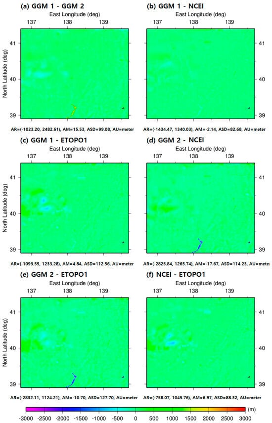 In terms of comparing the bathymetry differences, the difference between the GGM 1 and NCEI gridded model exhibited better results with the smallest standard deviation of 82.68 m, as in Table 5. Figure 8a,d,e convey the large differences between GGM 1 and GGM 2, GGM 2 and NCEI, and GGM 2 and ETOPO1 in the southern part of this study area. These large differences were caused by the overestimated GGM 1 bathymetry and underestimated GGM 2 bathymetry in the southern part of this study area, as reflected in Figure 7a,b, respectively. The differences between GGM 1 and GGM 2 in the southern part of this study area ranged from 1024.3 to 2482.6 m, as shown in Figure 8a. The differences between GGM 2 and NCEI and GGM 2 and ETOPO1 in the southern part of this study area ranged from −2832.1 to −1031.8 m, as illustrated in Figure 8d,e.