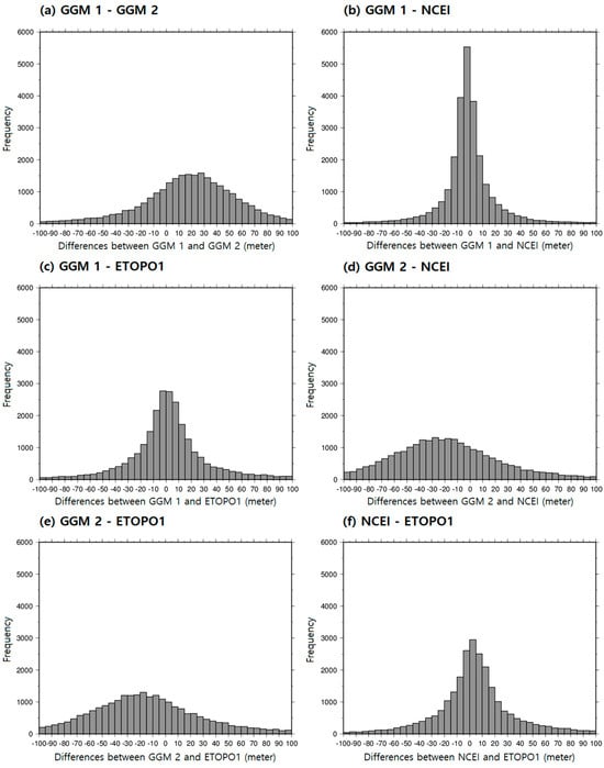 The histograms of depth difference values between four bathymetry models in Figure 9 indicate that about 95% of the differences between GGM 1 and NCEI were ±85.0 m. Compared to the histogram of depth difference between GGM 1 and NCEI, the other differences are 89.41%, 87.98%, 85.87%, 82.66%, and 89.85% for GGM1—GGM 2, GGM 1—ETOPO1, GGM2—NCEI, GGM2—ETOPO1, and NCEI—ETOPO1, respectively, in the same range.
