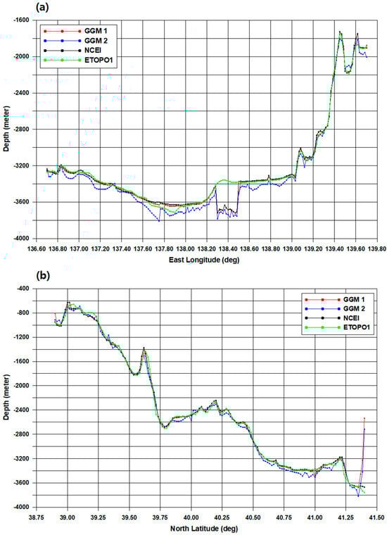 GGM 2 bathymetry was overall underestimated in the east-west direction along 41° N, as shown in Figure 10a. In particular, the maximum discrepancy of the differences between GGM 2 and ETOPO1 was 393.2 m between 138.20° and 138.60° E. In Figure 10b, the maximum difference between GGM 1 and ETOPO1 reached 1220.0 m between 41.3667° and 41.4000° N due to overestimated GGM 1 bathymetry in the north-south direction along 138.5° E.