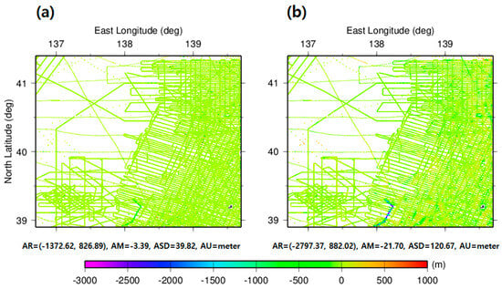 In addition, the accuracy of the GGM 1 and GGM 2 bathymetry models predicted using the exponential GPR model of machine learning and GGM was evaluated by interpolation on the 108,056 NCEI shipborne locations, which are represented by the black dots in Figure 2a. Table 8 specifies that the RMSE of the depth differences between GGM 1 and NCEI is smaller than that of the depth differences between GGM 2 and NCEI. Figure 11 shows the depth differences (a) between GGM 1 and NCEI and (b) between GGM 2 and NCEI at 108,056 shipborne depth locations. Consequently, the GGM 1 model using a tuning density contrast of 13.63 g/cm3 in comparison with that using a density contrast of 1.67 g/cm3 shows an improvement of 67.40% in the RMSE at 108,056 shipborne locations of the NCEI. These findings imply that the GGM 1 bathymetry model predicted using the exponential GPR model of machine learning can generate accurate bathymetry around the Yamato basin in the East Sea. The enhancement in accuracy of 82.64 m of GGM 1 in comparison with GGM 2 concludes that satellite altimetry-derived FAGAs and an optimal machine learning model can effectively estimate accurate bathymetry.