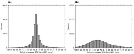 The histograms for the depth differences on the NCEI shipborne locations (a) between GGM 1 and NCEI (b) between GGM 2 and NCEI.