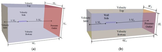 As the blockage effect exists, the calculation domain and boundary conditions differ between the infinite and finite domains. The calculation domain is a cuboid, and the solid body is a full-scale AUV model, which is positioned at the center of the cross-section. Additionally, a no-slip boundary requirement is enforced on the hull. Figure 3 depicts the calculating domain’s border conditions and sizes. In the infinite domain, the inlet, side, top, and bottom are all set as velocity inlets, while the exit is set to zero relative pressure. The infinite domain size is defined as 6Lc × 5Lc × 5Lc, referring to the literature [27,28]. In the finite domain, the difference is that the side is specified as the no-slip wall. The finite domain size is defined as 6Lc × Wb × Ht, where Wb represents the various widths of the calculation domain for assessing the various blockage ratios. The parameter Ht indicates the height of the calculation domain that is the same as the towing tank (170 m × 7 m × 6 m) at Northwestern Polytechnical University (NWPU), whereas the maximum velocity is 7 m/s. The front inlet and back outlet of the domain are separately placed at the distances 1.5Lc and 4.5Lc from the head, where the origin of the coordinate system is located.