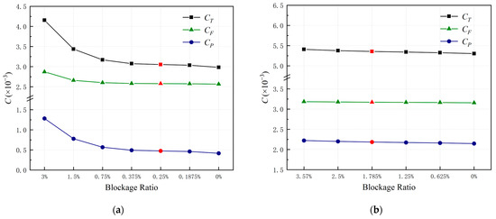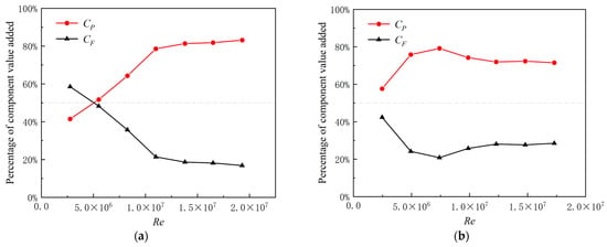 Table 5 presents the resistance coefficients of ARBUV with various Reynolds numbers in the infinite domain and finite domain whose size is equal to the NWPU towing tank. The contribution of frictional resistance to the total resistance is greater than 84%. The total resistance coefficients of a finite domain are mainly larger than those of an infinite domain. The improvement in percentage of CT is 5.40% for Re = 2.76 × 106. Additionally, it is 2.37% for Re = 1.93 × 106. On one hand, it proves the blockage effect on resistance coefficients. On the other hand, the blockage effect on resistance coefficients weakens while the Reynolds number increases. To further analyze the variation in each resistance component, the proportion of the increase in frictional resistance and pressure resistance to that of total resistance is given in Table 5. Moreover, the results are displayed using line charts in Figure 7a. It is noted that the pressure resistance dominates the increase in total resistance among various Re.