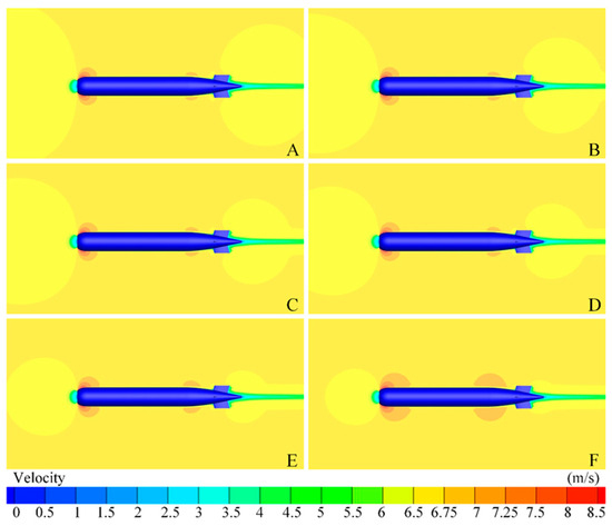 Velocity contour of ARBUV axisymmetrical surface under different blockage ratios (A): BR = 0%, (B): BR = 0.1875%, (C): BR = 0.25%, (D): BR = 0.375%, (E): BR = 0.75%, (F): BR = 1.5%.