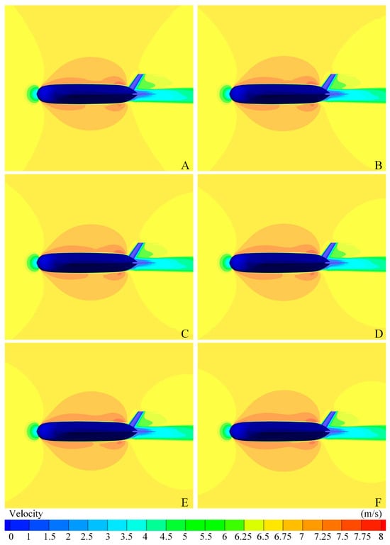 Velocity contour of BWBUV symmetrical surface under different blockage ratios (A): BR = 0%, (B): BR = 0.625%, (C): BR = 1.25%, (D): BR = 1.785%, (E): BR = 2.5%, (F): BR = 3.57%.