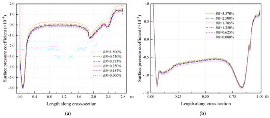 The pressure coefficient distribution along the cross section of the ARBUV and BWBUG models is separately shown in Figure 11. It is observed that the distribution patterns of surface pressure coefficients along the cross section of the ARBUV and BWBUV are nearly identical under various blockage ratios. In fact, it gradually decreases as the blockage ratio decreases. Significant changes in pressure coefficient occur near locations where the hull shape obviously changes. Two AUV models reach their maximum pressure coefficient values at the bow (when the position is 0 m). And it goes sharply to minimum values as moving to the back. Minimum pressure coefficient values also occur around the recessed areas of the hull and at the fins and rudder locations. There are some localized differences in details between ARBUV and BWBUV models. The minimum pressure coefficient occurs in the bow transition area for ARBUV, whereas it occurs at the stern hull transition for BWBUV.
