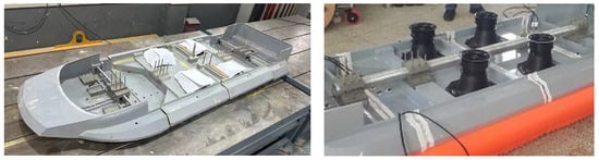 Special attention was paid so as to ensure the segmentation cross sections were not located at the positions of fans and air ducts. Based on the weight distribution of the entire hovercraft as well as the structural integrity of the model, four longitudinal segments were used to constitute the entire model. The segmentation cross sections are located at LC/4 (stern), 2LC/4 (mid-ship), and 3LC/4 (bow). A 10 mm gap was ensured between the neighboring segments. The segments were connected using a backbone to form the scale model. Strain gauges were installed on the backbone to measure the strains at the segmentation cross sections. Thin elastic rubber strips were used to seal the gaps between segments for the purpose of water tightness.
