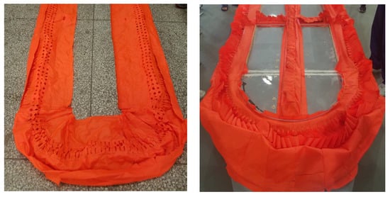 The skirt, shown in Figure 3, is made of flexible fabric with a weight-to-area ratio of . Vent holes are fabricated on the bag of the skirt, and two partitioning skirts are attached to form four chambers. Four axial flow lift fans are used to pump air into the air cushion, as shown in Figure 4, and each of them weighs 3.0 kg. The formula used to fit the fan’s theoretical characteristic curve takes the following form: