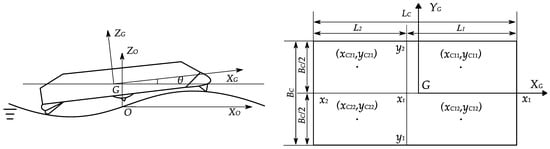 By placing the origin at the center of gravity of the hovercraft, a body-fixed coordinate system, G-XGYGZG, is defined, as shown in Figure 6. The static equilibrium equation [3,4] of the hovercraft is used to solve the static cushion pressure in the air chambers as follows: