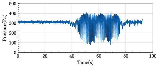 To investigate the influence of surface elevation on the cushion pressure based on the experimental data, the PC-VC fitting relationship of the front and rear air chambers above and the static and dynamic equilibrium equations in Section 2.2 were used to calculate the static hovering cushion height. Then, the equations of hovercraft motion in waves and the air chamber response model were established to solve for the hovercraft motion in the time domain. Since the cushion volume is affected by the surface elevation, the cushion pressure was solved by using Equations (9) and (10). The combined force of gravity and cushion pressure causes the hull to heave and pitch. Based on the average fitting equations, a series of numerical calculations were carried out to obtain the hovercraft motion in the test conditions.