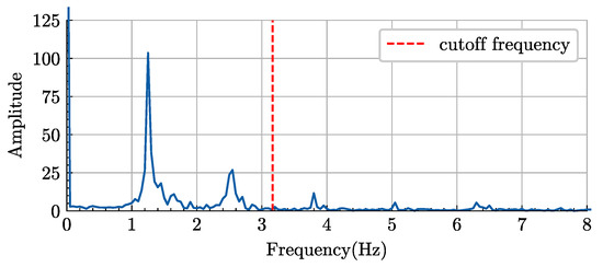 As shown in Figure 7, the hovercraft tank towing test is roughly divided into a wave-making stage, an acceleration stage, a stationary stage, and a braking stage. The stationary stage has an effective window for measuring the responses (motion, load, pressure, etc.), and it is obvious that the sagging cushion pressure is greater than the hogging cushion pressure. The measurements in the stationary stage (50~70 s), as shown in Figure 7, were used for the FFT, and the results are shown in Figure 8, where it can be seen that the major frequency component is the same as the encounter frequency. In the low-pass filter, a cutoff frequency 2.5 times the encounter frequency was used. In this study, PC is the cushion pressure obtained by deducting the standard atmospheric pressure P0 from Pa, and Pa in the PaV is the cushion pressure including the standard atmospheric pressure, that is, Pa = P0 + PC.