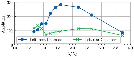 A frequency-amplitude plot of the front-left air chamber pressure (λ/LC = 2.2).