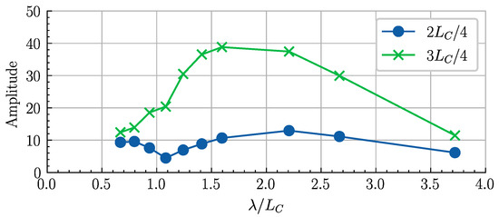 As shown in Figure 12, the hovercraft differs from traditional surface displacement ships. Owing to the pulsating cushion pressure in the front and rear air chambers, it exhibits certain independent response characteristics. Its maximum vertical bending moment does not necessarily occur near the mid-ship cross section. For example, the bending moment response at the 3LC/4 cross section, as shown in Figure 12, is marginally larger than that at the mid-ship cross section. Unlike the cushion pressure and acceleration, the bending moment response at the mid-ship cross section reaches the maximum λ/LC near 1.0. The magnitudes of the dimensionless mid-ship and 3LC/4 bending moments are, in general, in the order of 10−3. Compared with the hovercraft in [15], the magnitude of 10−2 of the dimensionless mid-ship bending moment is one order of magnitude smaller, which is likely related to the mass distribution.