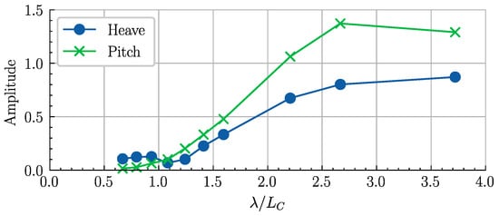 As shown in Figure 11, as λ/LC increases, the pitch response approaches 1.3 and exceeds the wave steepness. This is very different from that of surface displacement ships because the hovercraft is supported by the air cushion rather than buoyancy. The skirt is flexible, and it continues to deform after touching the water surface, under the action of slamming force during the vertical bow-down motion, and under the action of horizontal force from the wave’s impact on the skirt due to the high forward speed of waves.