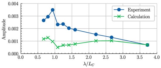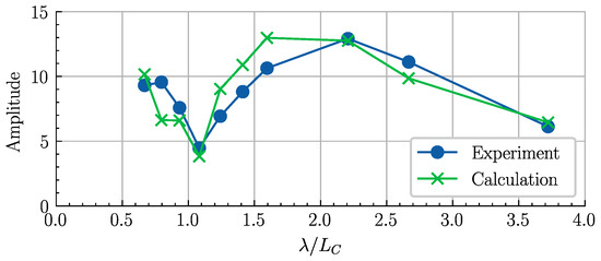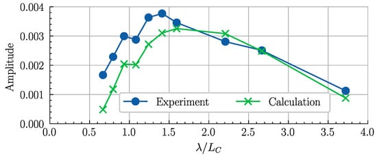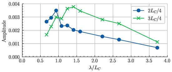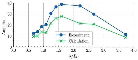 As shown in Figure 10, since the acceleration is closely related to the cushion pressure pulsation, the acceleration has a maximum peak value when λ/LC is between 1.5 and 2.0. Compared with the dimensionless acceleration in [15], where the model has similar main dimensions, the acceleration of the model in this study is generally smaller, which is a result of the difference in mass distribution. Generally, the acceleration response at the 3LC/4 cross section is greater than that at the mid-ship cross section.