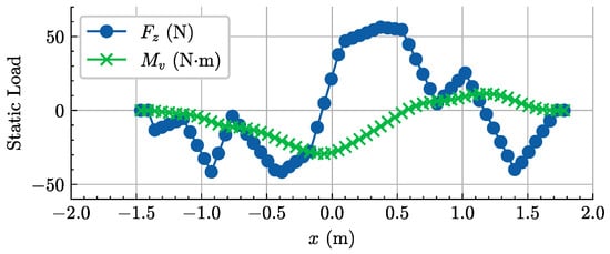 The hovercraft’s static equilibrium equation is satisfied during the static hovering process. The static pressures of the front and rear air chambers are calculated using Equation (2), and they are 264.6 Pa and 267.9 Pa, which is generally consistent with the measured cushion pressure (260~270 Pa) in the static cushion test of the hovercraft. Figure 13 shows the calculated vertical shear force Fz and vertical bending moment Mv distribution of the cross sections along the vessel’s length.