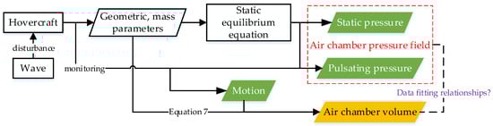 where is the cushion volume of the air chamber; is the area of the air chamber; is the height of the air chamber at the center; is the height of the center of gravity of the hovercraft when static hovering; is the trim angle; . are the coordinates of the air chamber centroid; and are the heave, pitch, and roll motions, respectively.