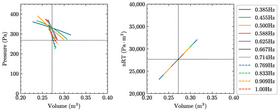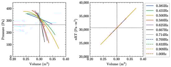 Since the influence of surface elevation cannot be considered in the cushion volume of the experimental model, while the surface elevation will affect the cushion volume in the calculation model, the pressure-volume results calculated from the numerical calculation model deviate from the experimental results. As shown in Figure 22, the surface elevation likely has a significant impact on the cushion pressure in the wave frequency range of [0.588, 0.714] (corresponding wavelength-to-cushion length ratio of [1.6, 1.08]), resulting in a large gap between the calculated cushion pressures and the actual measured pressures. This phenomenon suggests a strong correlation between the surface elevation and the cushion pressure. Specifically, changes in surface elevation directly affect the pressure values within the air chamber, which should be a crucial factor for consideration in future research.