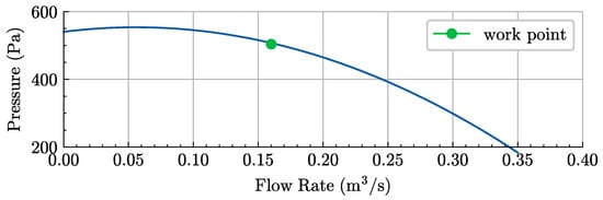 where P is the fan pressure head (Pa), and Q is the fan flow rate (m3/s).