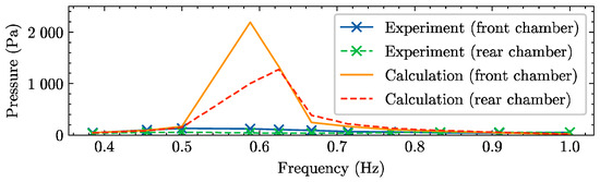 In Figure 14, Figure 15, Figure 16 and Figure 17, based on the front and rear air chamber pressure time series obtained from the seakeeping test, the acceleration, cross-section load time series, and their amplitude were solved using the simplified kinematic model of the hovercraft (see Equation (5)) and the d’Alembert principle and compared with the test values.