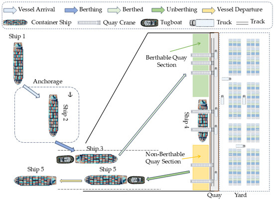 As shown in Figure 1, the integrated scheduling problem of tugboats, berths, and quay cranes studied in this paper can be described as follows. After arriving at the port, vessels enter the anchorage area. If the number of available tugboats meets the required number for assisting a ship in entering the port, the corresponding tugboats will be allocated to facilitate its entry. If the available tugboats cannot meet the number requirements, the vessel waits at the anchorage until sufficient tugboats are available. Similarly, if there are not enough continuous berths available on the quay line, the vessel also needs to wait at the anchorage until sufficient berths are free to enter the port. Once berthed, quay cranes are immediately allocated to the vessel for loading and unloading operations. If the vessel’s berthing position deviates from its preferred berth, additional container truck transportation costs are incurred, referred to as berth deviation penalties in this paper. Since all quay cranes move on the same track, they cannot cross each other. If the number of available tugboats meets the required number for assisting a ship in leaving the port, the corresponding tugboats will be allocated to facilitate its departure. If the available tugboats do not meet the number requirements, the vessel waits at the berth until enough tugboats are available for departure. Time-variant constraints on the number of quay cranes were considered in this work. During the vessel’s waiting period after the completion of loading and unloading operations, the quay cranes allocated to this vessel can move to other berths to handle other newly berthed vessels. This study primarily addresses the uncertainty in vessel arrival times by implementing a buffer period. After a vessel completes its loading and unloading operations, the berth it occupied must remain vacant for a designated buffer time before accommodating a new incoming vessel. As illustrated in Figure 1, after entering the port, Ship 3 can only dock in the green-marked mooring area near the shoreline and is prohibited from docking in the yellow-marked non-mooring area because Ship 5 has just vacated that zone, which must remain unavailable for other vessels until the buffer time has expired. This buffer period allows for adjustments in the loading and unloading schedules when there are fluctuations in vessel arrival times. The larger the buffer interval, the higher the stability of the model.