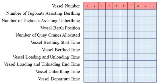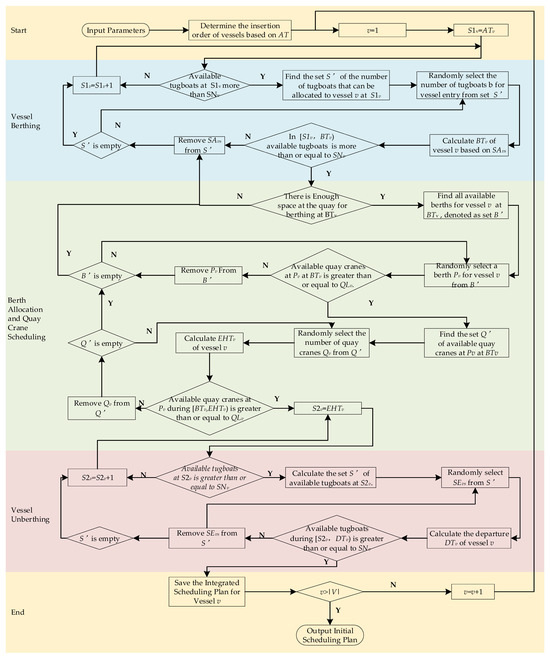 Based on information such as the vessels, quay cranes, and tugboats, an initial feasible solution was generated. The process for generating the initial solution is illustrated in Figure 3.