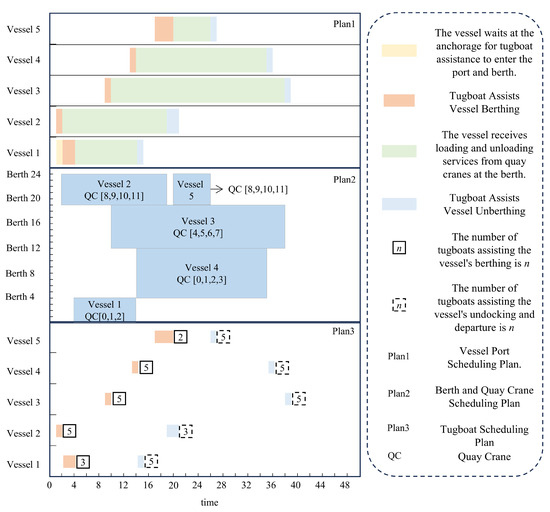 Gantt chart of integrated scheduling for tugboats, berths, and quay cranes.