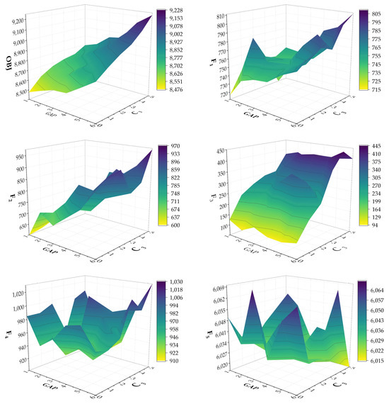 To validate the impact of uncertainty factors and berth preference on integrated scheduling, different buffer time intervals (GAP) and berth deviation control coefficients (C3) were set. A case with 20 arriving vessels was used as the research object, and the objective function value (OBJ) as well as F1, F2, F3, F4, and F5 under different GAP and C3 conditions were calculated. The results are shown in Figure 6. Analysis showed that as C3 increased, OBJ also increased. The increase in OBJ was mainly related to the increase in F1, F2, and F3. As C3 increased, the rate of increase in F3 gradually decreased, indicating that the berth deviation of all vessels became smaller as C3 increased. Meanwhile, the combined increase in F1 and F2 showed an increasing trend, indicating that an increase in C3 led to longer vessel waiting times in the port, delayed departure times, and increased time in the port. It is necessary to balance the berth deviation costs and time-related costs based on the actual operating conditions of the port and select an appropriate C3 value.