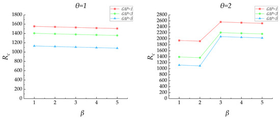 An increase in the vessel buffer time GAP led to an increase in F1, F2 and OBJ, while the values of F3, F4, and F5 remained relatively unchanged, resulting in an increased OBJ value. Reserving a certain buffer time interval causes vessels with similar arrival times and berths to wait for a period before entering the port for loading and unloading services, thereby delaying the berthing and departure times and increasing the waiting and delayed departure costs. When determining the situation of uncertain arriving vessels, it is necessary to reschedule the uncertain vessels based on the original scheduling plan. After rescheduling, the scheduling cost will inevitably increase. The higher the stability of the original schedule, the smaller the increase in cost compared to the original plan after rescheduling. The increase in rescheduling cost is denoted as Rc, where Rc = OBJ* − OBJ, with OBJ* being the total cost after rescheduling and OBJ being the total cost of the original schedule. To verify the stability of the model under different GAP values, this study introduced various scenarios of uncertain vessel arrivals. The key metrics for measuring these uncertain scenarios were the number of delayed arriving vessels, denoted as θ, and the vessel arrival delay time, denoted as β. Figure 7 shows the Rc values obtained by the ALNS algorithm under different θ, β, and GAP conditions for a scenario with a fleet of 20 vessels. The analysis of Figure 7 revealed that the larger the GAP value, the smaller the RC value of the obtained plan, indicating higher model stability. Therefore, an appropriate GAP value should be selected based on the uncertainty fluctuation of vessel arrival times at the port, rather than arbitrarily choosing a large buffer time interval to cope with the uncertainty of vessel arrival times.