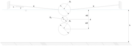 Single partially submerged cylinders have long been studied due to their relevance to ship design. For instance, Ursell [13] shows the expressions of the added mass and the scattered wave due to small heaving oscillations of a horizontal cylinder in 2D, followed by experimental [14] investigations. The 2D motion of a partially submerged cylinder is also presented in [15]. Borgman [16] studies the effect of oblique waves. Frank in [17] presents a computer program for calculating the hydrodynamic pressure, force, and moment of fluids on cylinders, using the 2D Green function. The approach cannot be directly applied to the structure investigated in this paper due to the presence of a lower cylinder, but it basically proves that the theoretical background for a numerical investigation was already present. In [18], the complete expressions of added mass and damping for heave, sway, and roll motion with coupling coefficients for sway and roll are given. The theoretical solution of the hydrodynamics of a half-immersed cylinder in infinite water depth, studied in two dimensions under beam seas (i.e., with the structure’s longitudinal axis parallel to the incident wave crests) is studied in [19]. With regard to the resonance period of a cylinder, [10] shows that the theoretical value of the added mass of a cylinder is , where D is the diameter. Assuming that the FB is cylindrical and semi-submerged and that the added mass is negligible, the reference period may therefore be assumed to be .