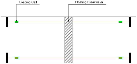 The FB is moored by four lines (Figure 3), each equipped with a strain gauge to measure the axial load. The lines are non-stretchable (Kevlar fibers) suspended by steel springs that simulate the elasticity of the prototypical compliant mooring. The lines are pre-stressed to avoid slack conditions; therefore, the four lines are always in tension, and the global stiffness is four times the stiffness of the single line. In order to provide enough flexibility and elongation to allow the spring to stretch within the elastic range, each anchoring line is tied by nine springs arranged in three parallel groups. The global mooring system yields a reaction force of approximately 1000 N/m and an elongation larger than 0.6 m.