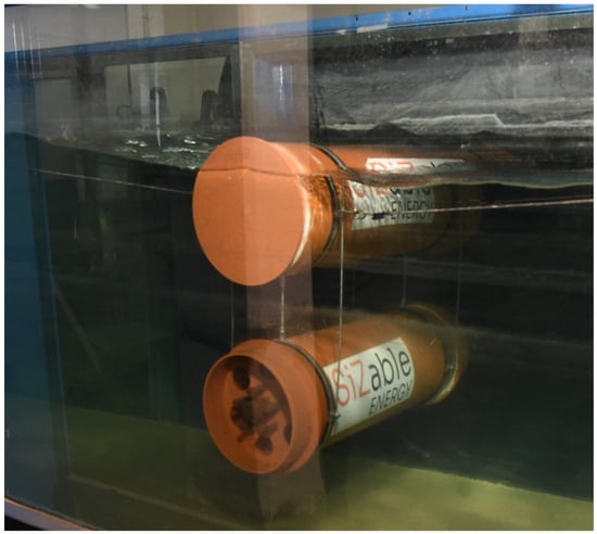 Three different FB configurations are tested (see Figure 2 and Table 1). Configuration A consists of two pipes, each with a 250 mm diameter, spaced 400 mm apart. Configuration B replicates A but includes an additional 125 mm diameter pipe positioned between the larger pipes. Configuration C comprises two pipes with a 250 mm diameter and a mutual distance of 300 mm. In each FB configuration, the two or three pipes are rigidly connected to form a single rigid body. All pipes are 0.98 m long, to fit the channel width. The top tube is sealed at both ends to prevent the passage of water, while the other tube(s) remain open to allow water inside the tube. In practice, these massive elements have a marginal submerged weight. An external steel frame assures that the structures behave as a single rigid body and prevents the structure itself from breaking. Symmetrically arranged steel rods weighing a total of 13.6 kg are inserted into the lower cylinder. These rods provide the necessary counterweight and, at the same time, improve the stability of the model.