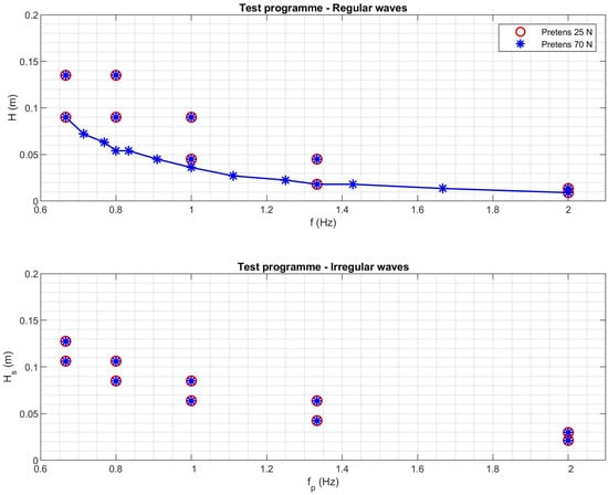 The test program is given graphically in Figure 5 and includes regular and irregular waves. The blue stars show the target incident wave characteristics generated for all configurations, with a spring pretension of 70 N. The tests carried out also for a lower pretension (25 N), only for Configuration A, are indicated by a red circle. Regular waves have a (target) wave period T varying between 0.5 s and 1.6 s and a (target) wave height H varying between 0.01 and 0.16 m (upper panel in Figure 5). Irregular waves have a (target) peak period also in the range 0.5 s–1.6 s, whereas irregular waves have a (target) significant wave height varying between 0.02 m and 0.14 m (lower panel in Figure 5). The tests used in the following sections for evaluating the Response Amplitude Operators (RAOs) and the transmission coefficient are only those connected by a blue line.