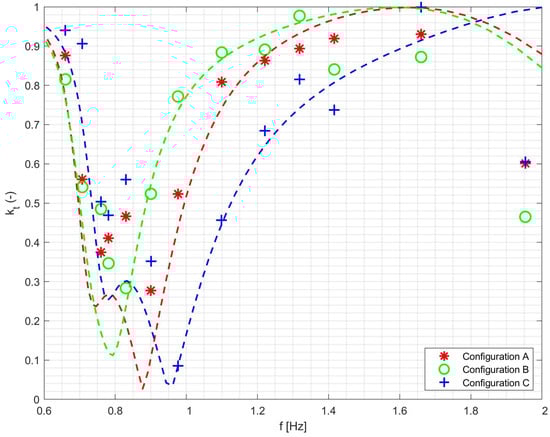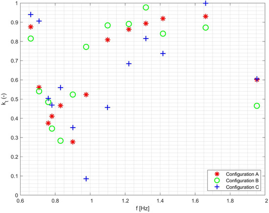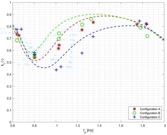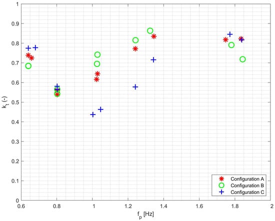 Figure 6 shows the experimental for all configurations as a function of the frequency of the incident waves. The curve is very different from the typical S-shape trend. Even if the frequency step is small, there is no evident trend. Of course, the response at high frequency (close to 2 Hz) is not particularly relevant, and the waves generated in the lab are a bit distorted since the wavemaker has a low-pass filter to avoid transversal waves.