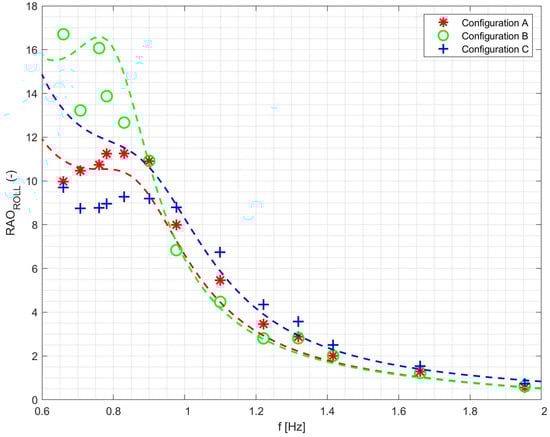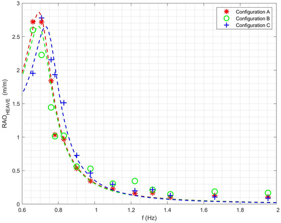 A more detailed description of the RAO graphs is given below. The experimental RAOs for heave are presented in Figure 8. Heave is independent of the other oscillation modes, and, in fact, the results show a typical resonator response. A clear peak is detectable for Configurations A and C (which the model can reproduce thanks to the assumption on the vertical stiffness described above), whereas the peak value of the curve for Configuration B is not obvious. In the range between 0.75 Hz and 0.85 Hz, the measured values for Configurations A and B show a small irregular step, not interpreted by the numerical model. At 1.2 Hz, the experimental measurement for Configuration B is slightly larger than a regular pattern would suggest.