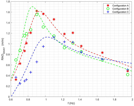 For the sway, the trend in the measurement is regular in general, with the exception of a few points. The observed trend and the differences among the different configurations are correctly predicted by the model in the whole range of frequencies. In particular, all RAOs for Configuration A are larger than those for Configuration C. For frequencies Hz, the RAOs for Configuration C become larger than those for Configuration B. For Hz, the RAOs for Configuration A become larger than those for Configuration B. Quantitatively, there are some differences. The data uncertainty does not allow us to pinpoint the exact RAO peak position; nevertheless, the experimental trend regularity is sufficient to suggest that the predicted peak positions have an error lower than 0.1 Hz. For Configuration C, the model overpredicts the horizontal RAO in the frequency range between 0.75 Hz and 1.0 Hz.