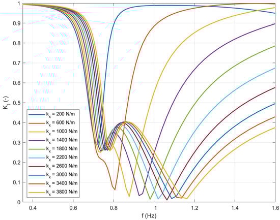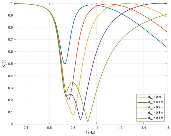 Figure 13 shows the effect of the CG depth in terms of . A lower gravity center is associated with a wider “filter”, a lower transmission, and a shift in the peak to the higher frequencies. In particular, when the steel bars are at the free surface (at depth ), the stop-band peak frequency is approximately 0.75 Hz, whereas when the steel bars are concentrated at the center of the lower pile (Configuration A where ), the stop-band peak frequency is 9.2 Hz. The width of the stop-band frequency at ranges approximately from 0 to 0.4 Hz, respectively, for the two mentioned cases.