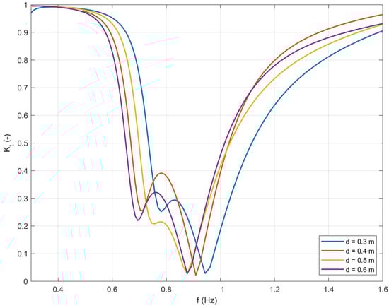 where d is the draft, w is the beam width, and g is the acceleration of gravity. Since the ratio effectively replaces both the non-dimensional wavelength and the non-dimensional draft as also confirmed by [11] for porous structures, it is a more convenient variable against which to plot the transmission coefficient. In general, box-type FBs are not efficient when the peak period of incident waves is significantly larger than .