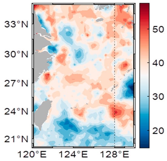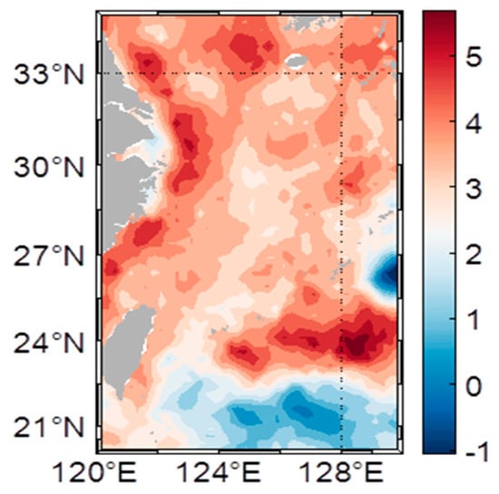 After removing the high-frequency components, the ECS sea level change signal is obtained by reconstructing the altimetry grid data. The average annual SLA over 27 years in ECS is shown in Figure 2. Figure 3 shows the spatial distribution of the linear trend in the mean annual sea level change in the ECS.